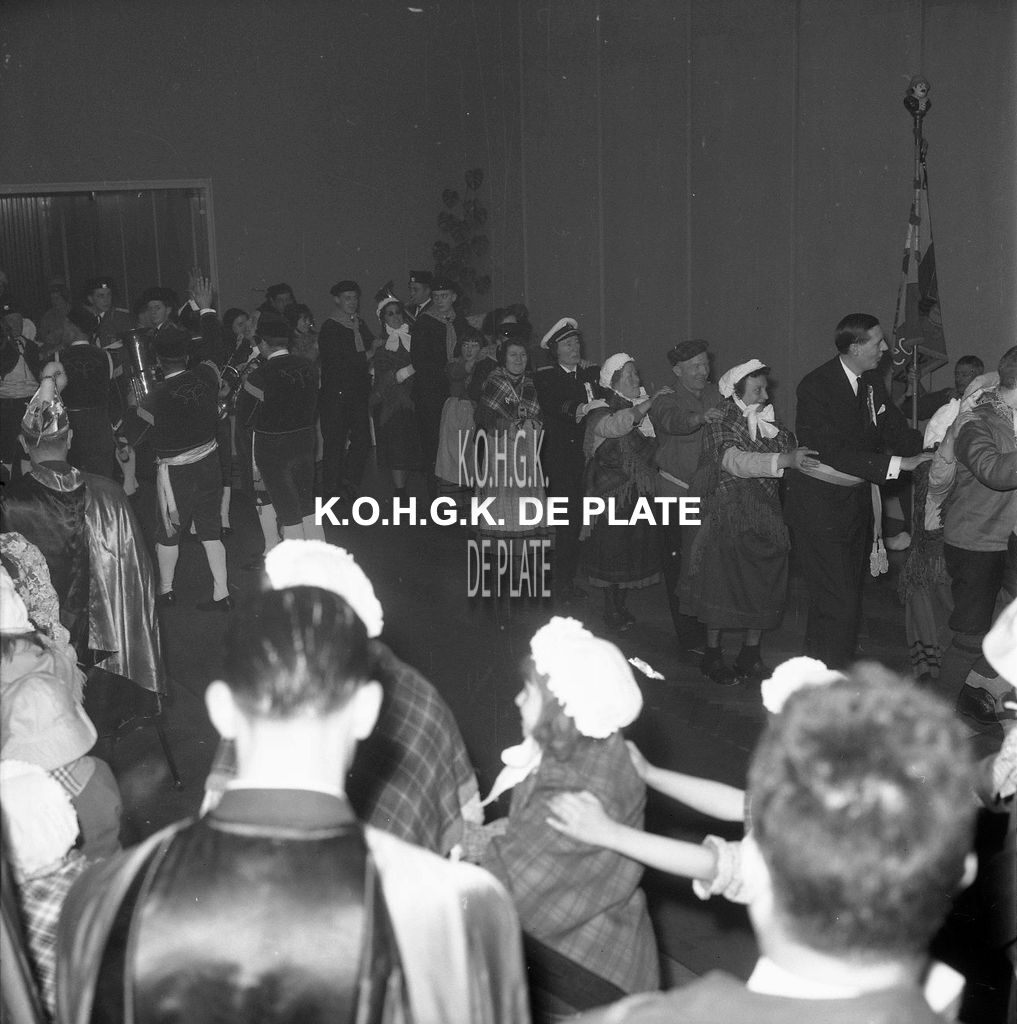 Negatief : 6 x 5,5 cm. - Ontvangst op het stadhuis. - Farandole op het stadhuis naar aanleiding van de ontvangst van de prinsen carnaval. We herkennen o.a., burgemeester Jan Piers, leden van de "Vismijnvrienden" en de "Oude Ijslandvaarders"...