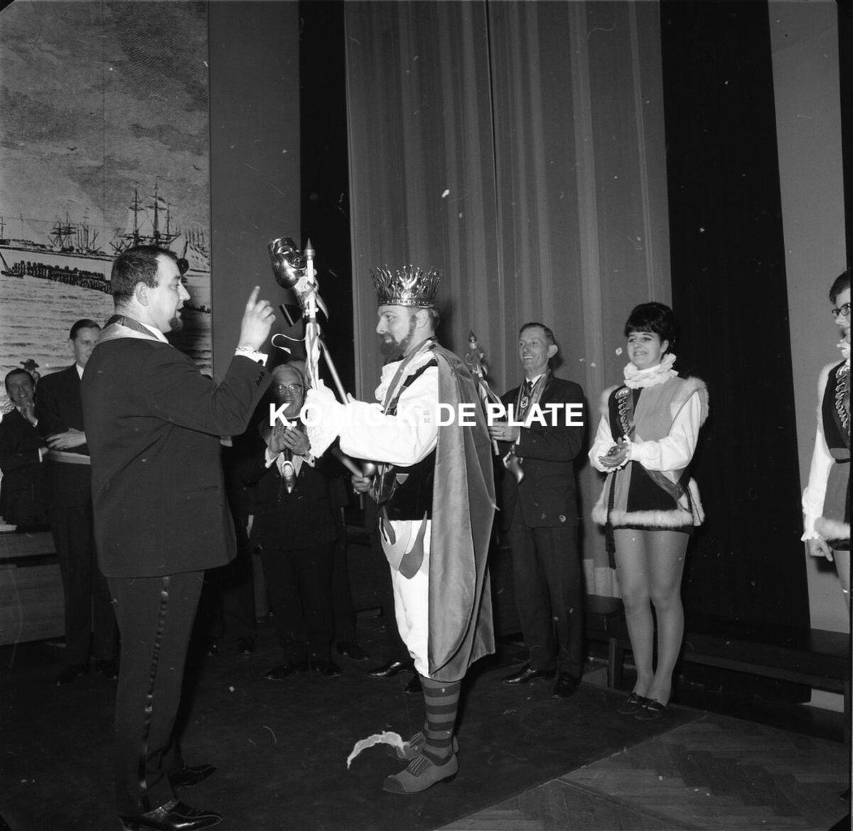 Negatief : 6 x 5,5 cm. - Ontvangst op het stadhuis. - Prins Carnaval van Oostende 1965 en links, Gerard Dangreau van de "Orde van de Kloeffe". Rechts, de twee eredames van de prins.