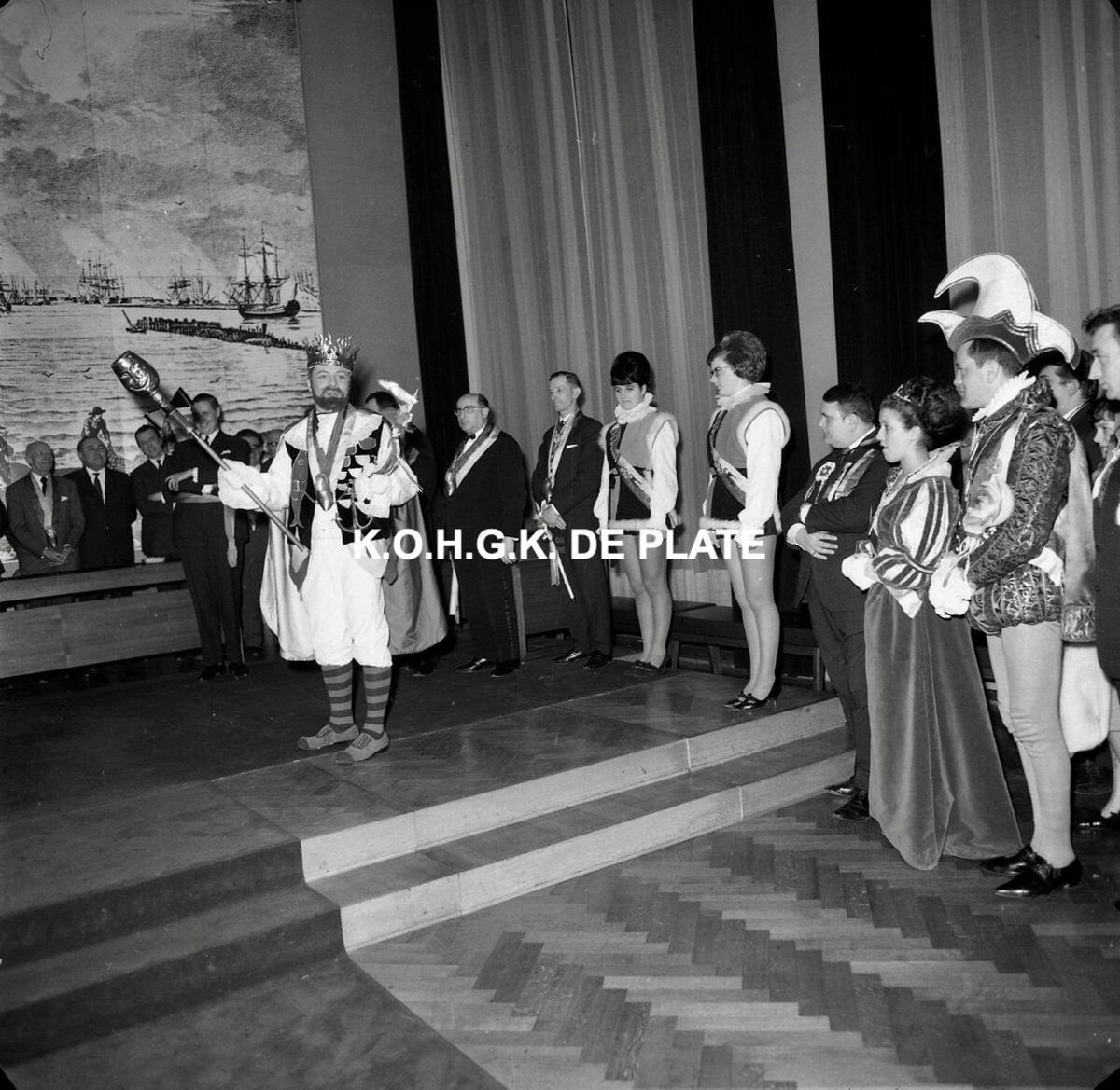 Negatief : 6 x 5,5 cm. - Ontvangst op het stadhuis. Prins Carnaval van Oostende 1965 en zijn twee eredames. Rechts, het prinsenpaar Albrecht en Isabella van Mariakerke 19£65