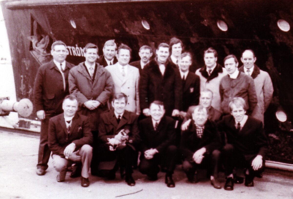 Afdruk, formaat : 21 x 29,5 cm. De "Prince Philippe" werd in 1973 verkocht en herdoopt tot "Strömma Rex" een Belgische bemanning bracht het schip naar Zweden. De bemanning keert terug uit Zweden. Staande : 3de persoon, Peter Depoorter (luitenant), 6de persoon, Albert Mahieu (commandant), zittend, 2de persoon, Heydrickx (?) (werktuigkundige) en uiterst rechts A. Billiet (luitenant)