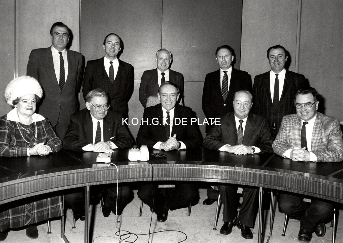 Formaat : 13 x 18 cm. - Het schepencollege 1983. Zittend v.l.n.r. : Jeanne Pauwelyn, Raoul Bonnel, burgemeester Julien Goekint, stadssecretaris Gaston Van Laere, Roland Makelberge.
