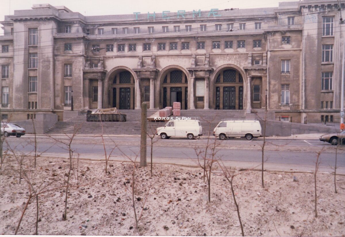 Foto : 15 x 10 cm. - De hoofdingang, gelegen langs de Koningin Astridlaan, tijdens renovatiewerken.
