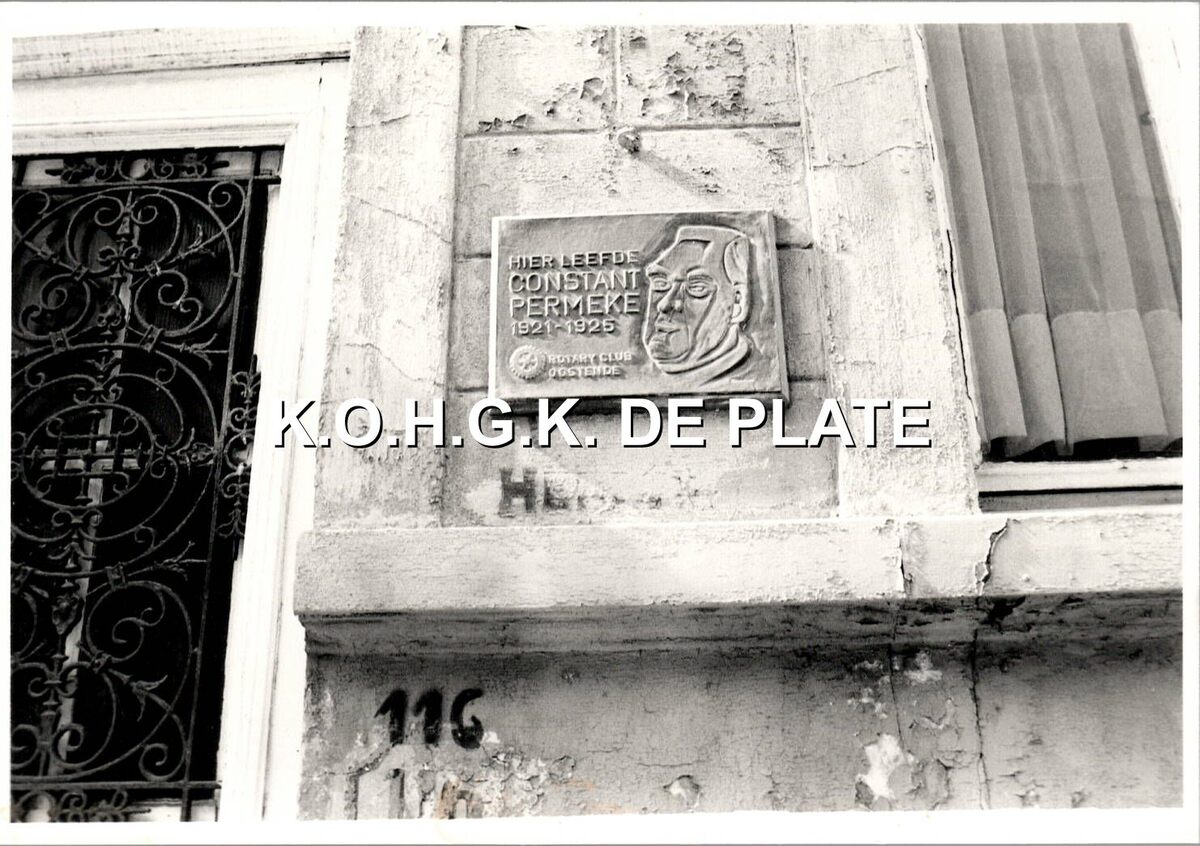 Formaat : 9 x 13 cm. - Gedenkplaat van Constant Permeke aan het burgerhuis in de Langestraat 116. Hij woonde er van 1921 tot 1925
