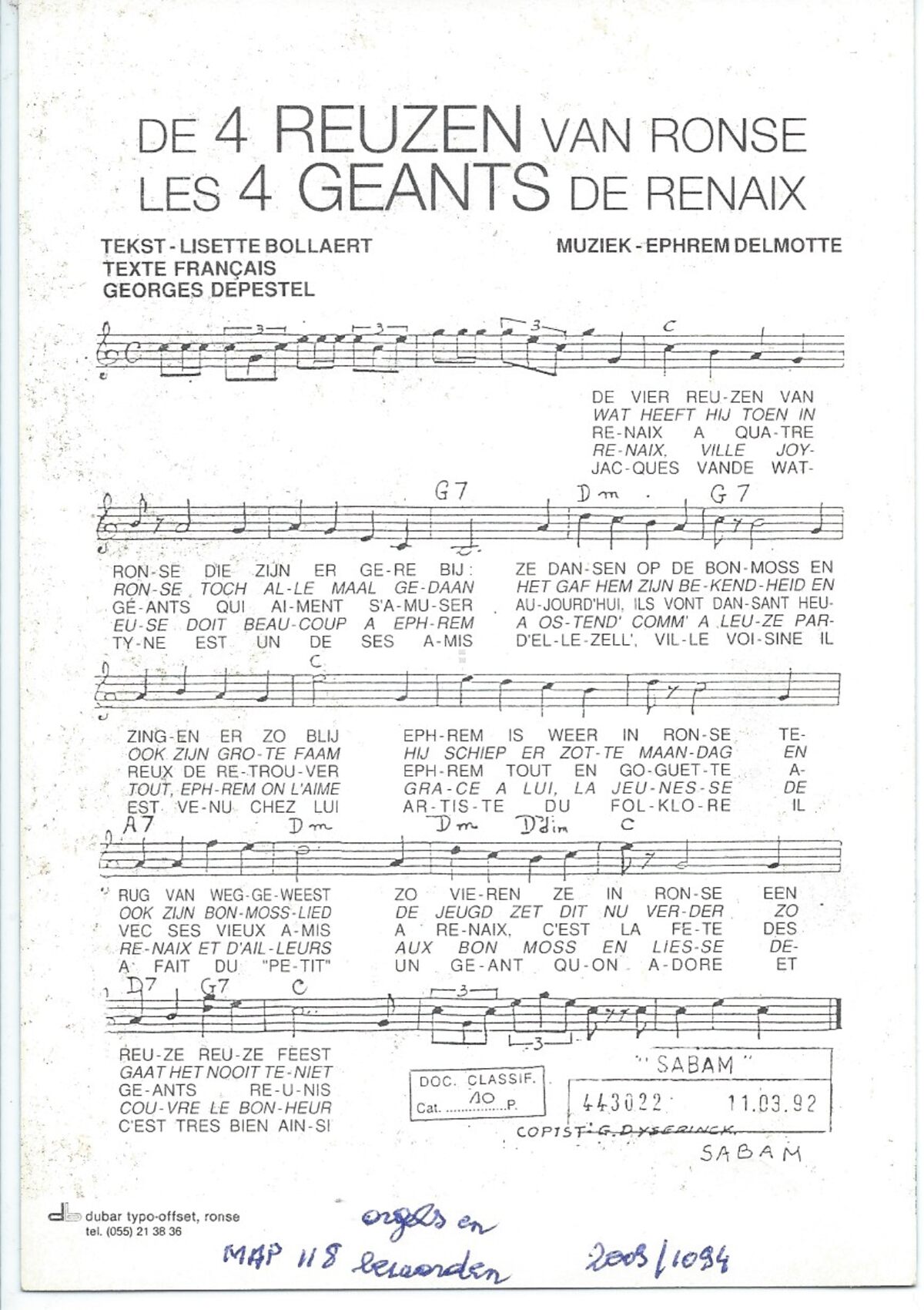Tekst : Lisette Bollaert. Franse tekst : Georges Depester. Muziek : Ephrem Delmotte.