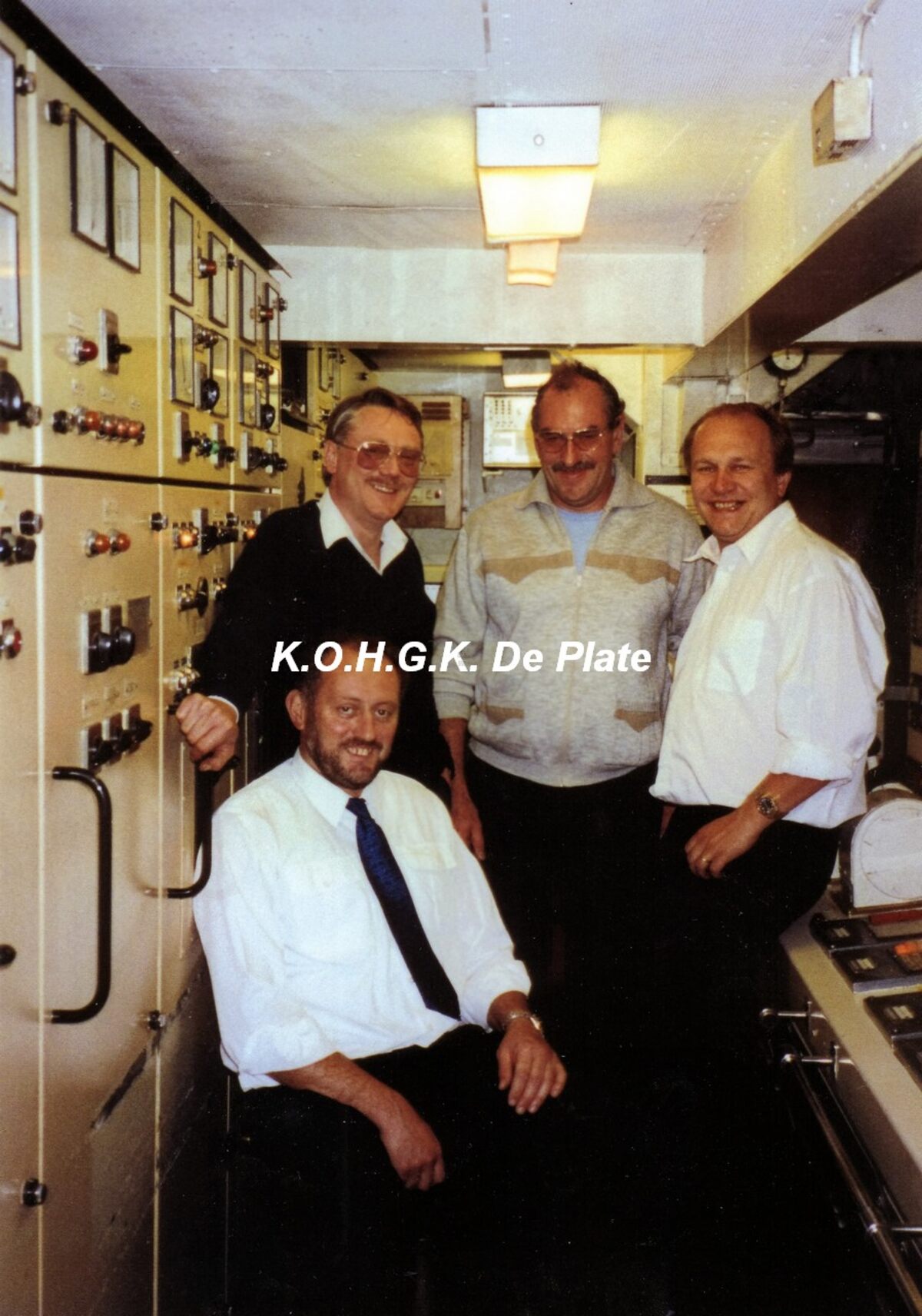 Afdruk, formaat :21 x 29.5 cm. - De controlekamer. Staande, van links naar rechts : elektrieker Barbé Adriën - officier werktuigkundige Van Poucke Etienne - elektrieker Decoster Erwin. Zittend : Pyson Arne chief-steward.