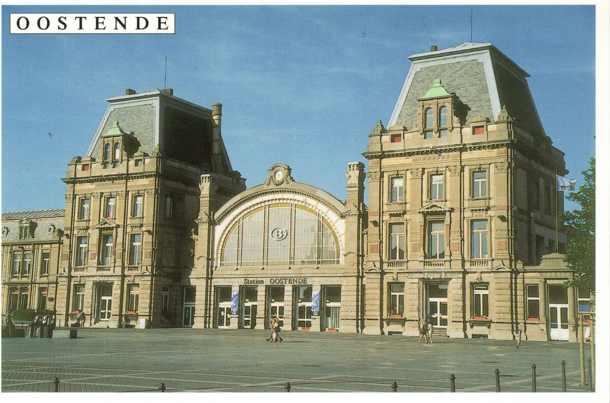 Tropic T 327. - In 1998 werd het Sationsplein heraangelegd in natuursteen waarin fonteintjes ingewerkt zijn en links, zien we het bronzen groepsbeeld "Vissersvrouwen" van August Michiels