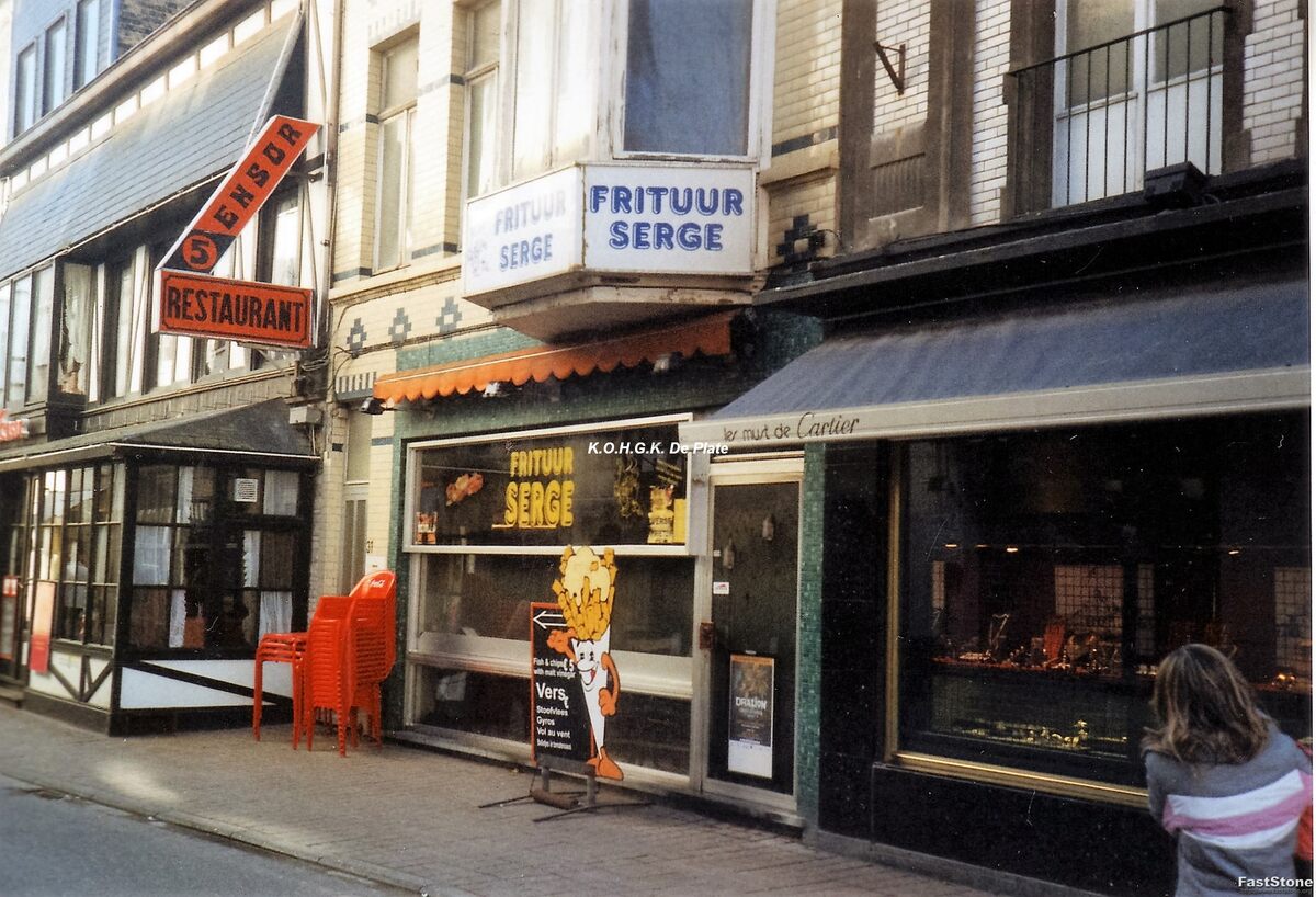 Foto 15 x 10. Christinastraat v.l.n.r. Restaurant Ensor 5, Frituur Serge en Juwelier Hulpiau op de hoek met de Langetraat