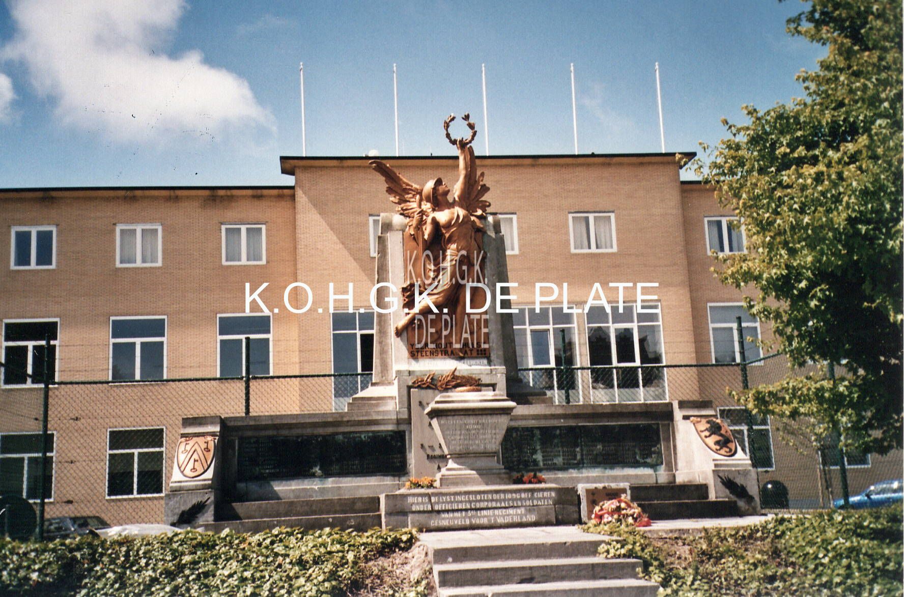 Formaat : 10 x 15 cm. - In 1923 onthuld. Monument gelegen in een plantsoen gelegen nabij de kazerne aan de Graaf de Smet de Naeyerlaan is het werk van beeldhouwer Marcel Rau. Beschermd als monument sedert 26 maart 2010. Op de achtergrond, de mijnenbestrijdingsschool