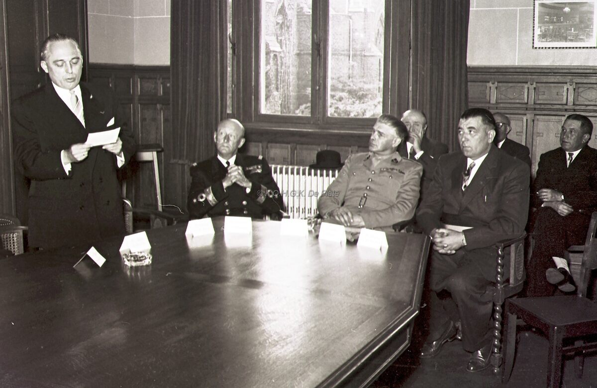 Ontvangst op het gemeentehuis van Middelkerke ter gelegenheid van de opening van het casino,een onbekend heer houdt een toespraak.De marineofficier is commodore Georges TIMMERMANS.