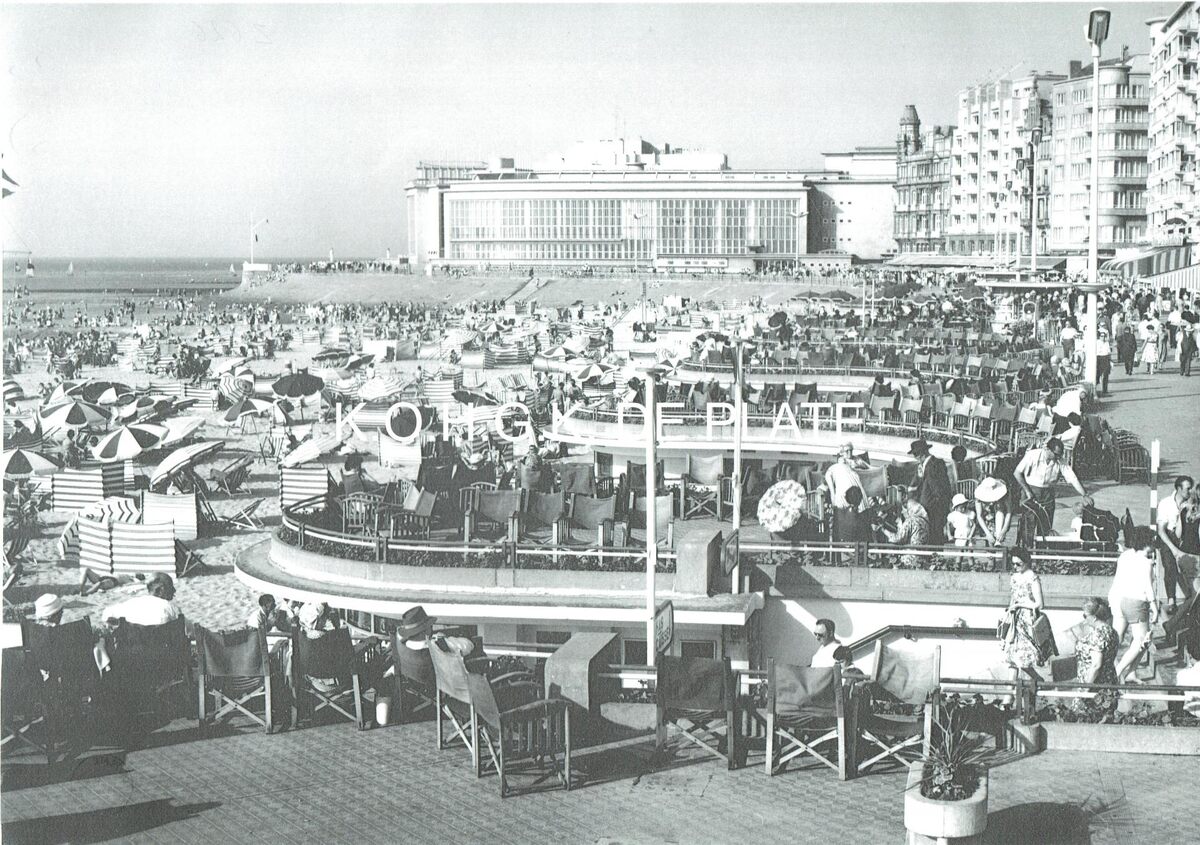Vergroting. - Formaat : 29,5 x 40. - Toerisme op het Groot Strand nabij de badinstallaties onder de Albert I-promenade. In de achtergrond de westgevel van het vierde kursaal