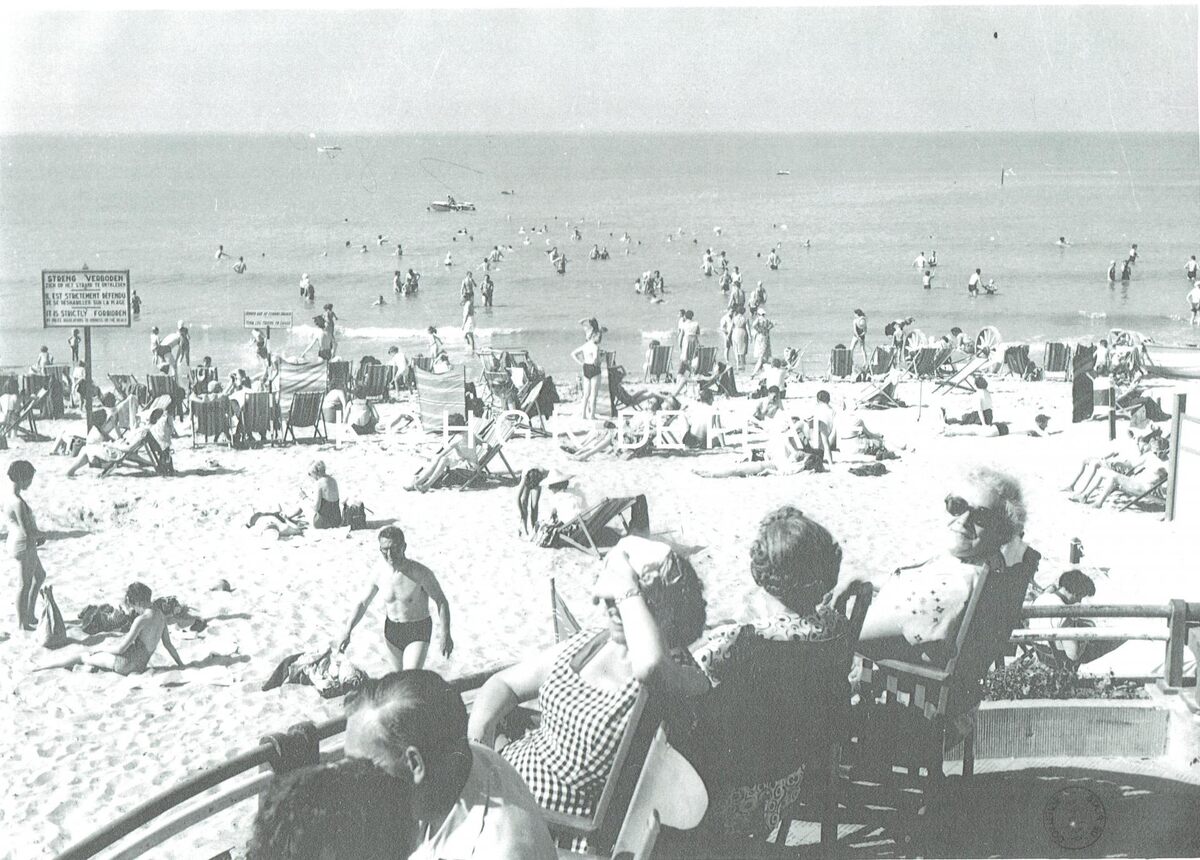Vergroting. - Formaat : 29,5 x 40 cm. - Genieten van de zon op het Groot Strand en dijk