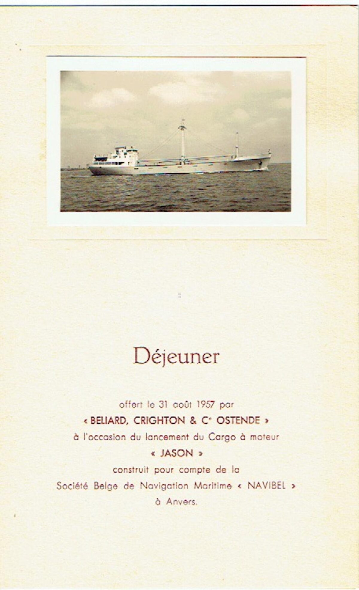 Déjeuner offert le 31 août 1957 par "Belliard, Crighton & C° Ostende" à l'occasion du lancement du Cargo à moteur "Jason" construit pour compte de la Société Belge de Navigation Maritime "Navibel" à Anvers