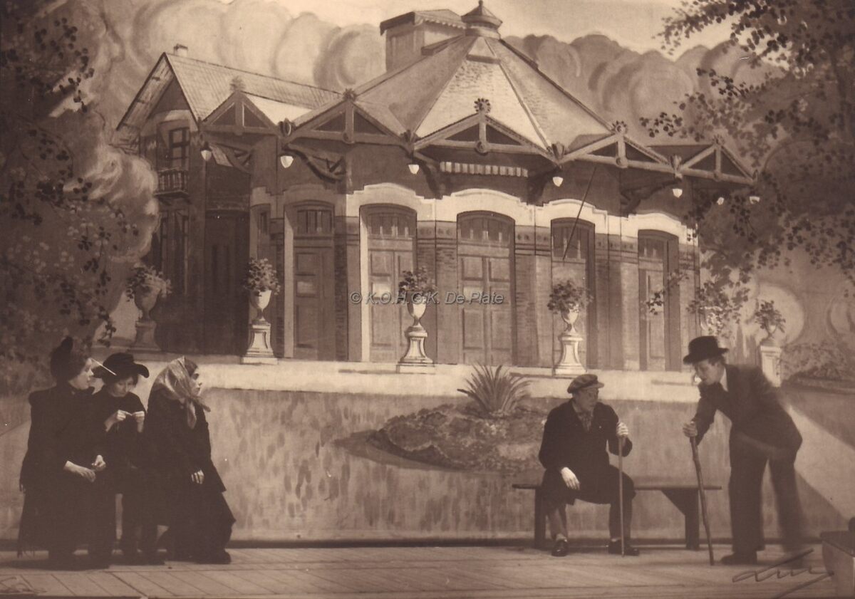 Tweede bedrijf : tafereel 2 : "'N den Hof" : scene uit de Oostendse Revue 1950.Decor Leopoldpark met het gebouw van het bronwater.