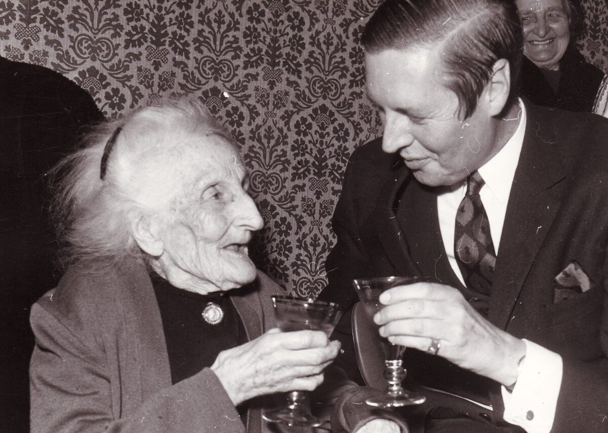 Formaat : 13 x 18 cm. - Burgemeester Jan Piers heft het glas met een 100-jarige vrouw.