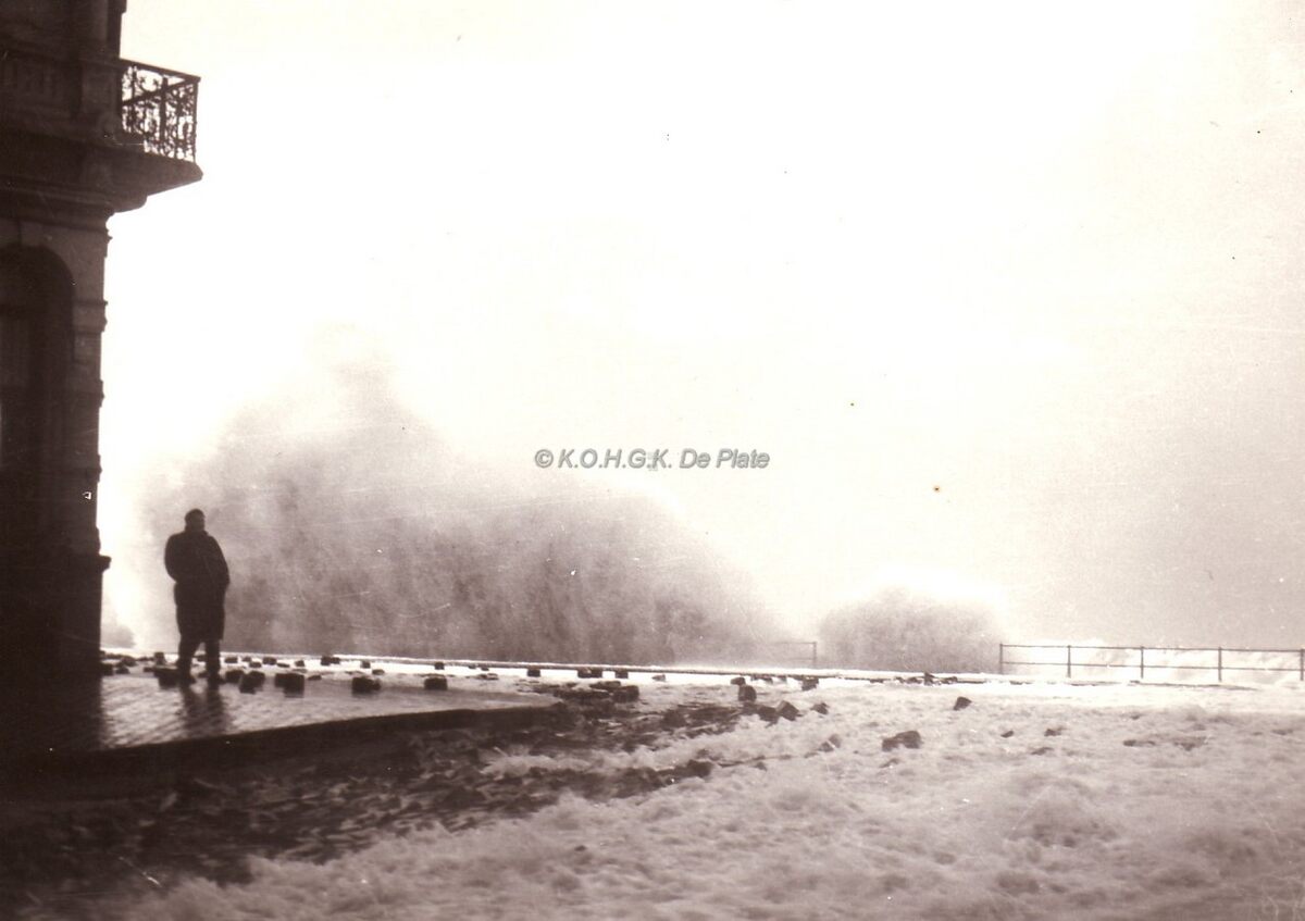 Overslaande golven aan de Albert I Promenade,hoek Capucijnenhelling (?) tijdens stormweer (01-03-1949), een stuk van de zeedijkreling is verdwenen en ettelijke stenen uit het wegdek gespoeld.