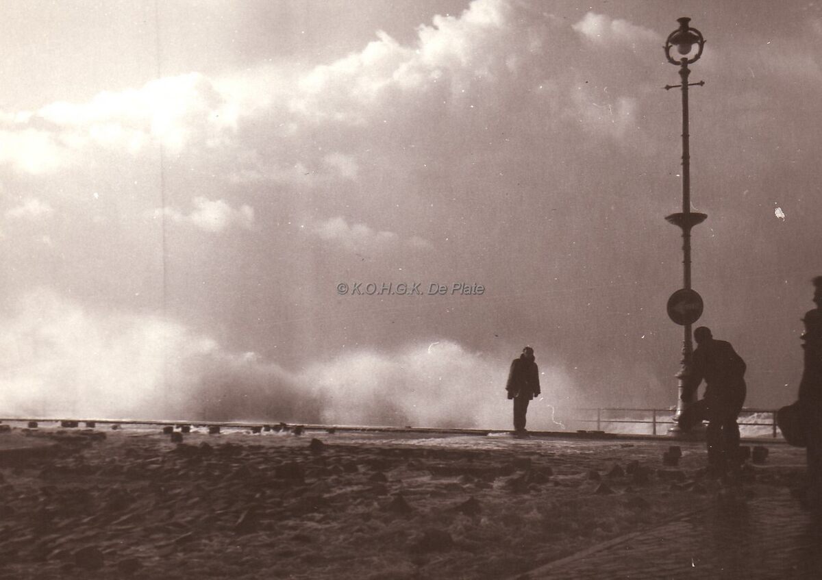 Albert I Promenade enkele moedige kijkers trotseren de stormwind om het schouwspel op de dijk mee te maken ter hoogte van de Vlaanderen helling.(?)