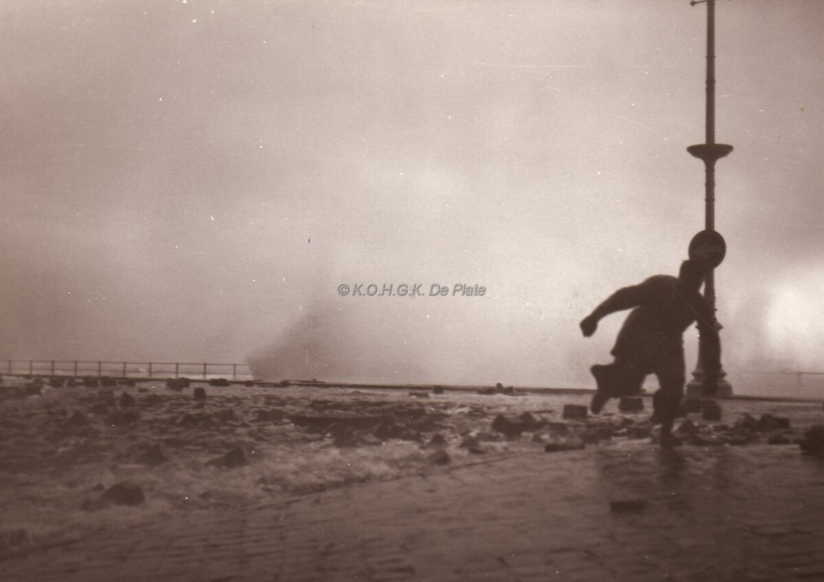 Albert I Promenade bij stormweer,het overgeslagen water stroomt de dijkhelling af.