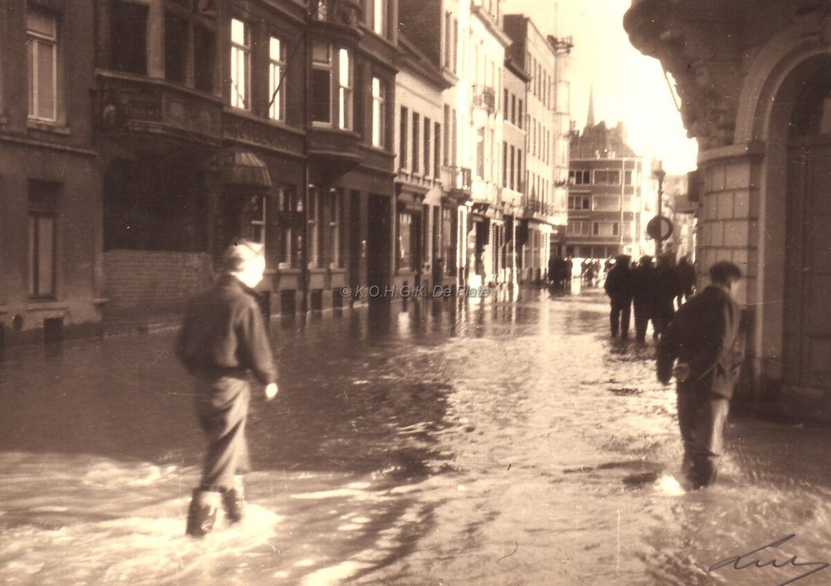 Hoek Lange- en Louisastraat onder water na voorjaarstorm in 1949,links achteraan de "Central".