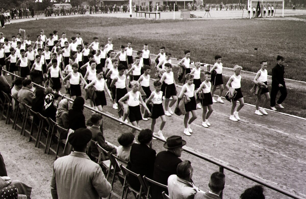 Een groep jongens in de optocht tijdens het zomerfeest van Hermes op hun stadion.