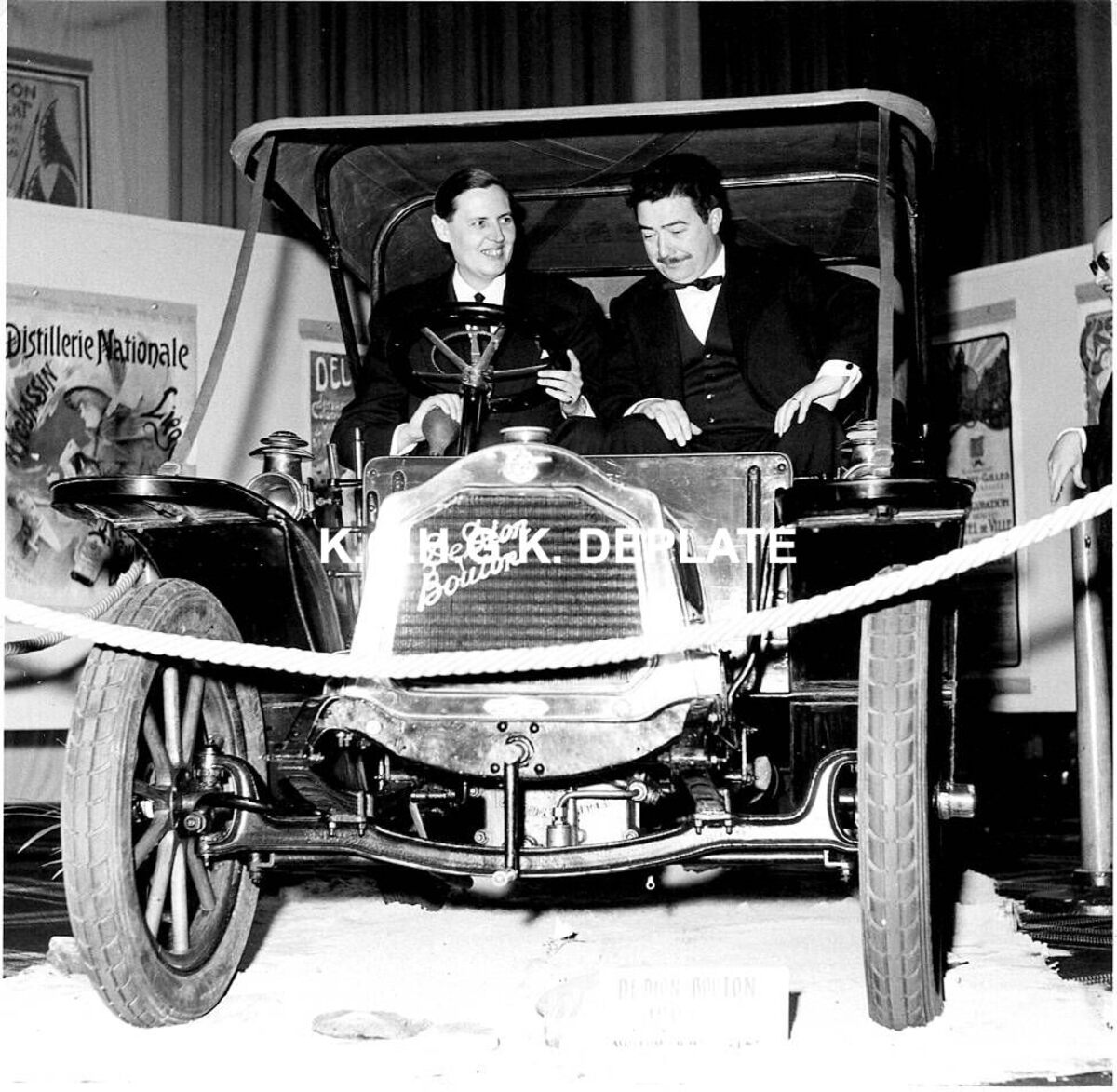 Formaat : 18 x 13 cm. - Burgemeester Jan Piers en schepen Roger De Kinder in een "De Dion Bouton" (1907) tijdens de opening van de tentoonstelling.