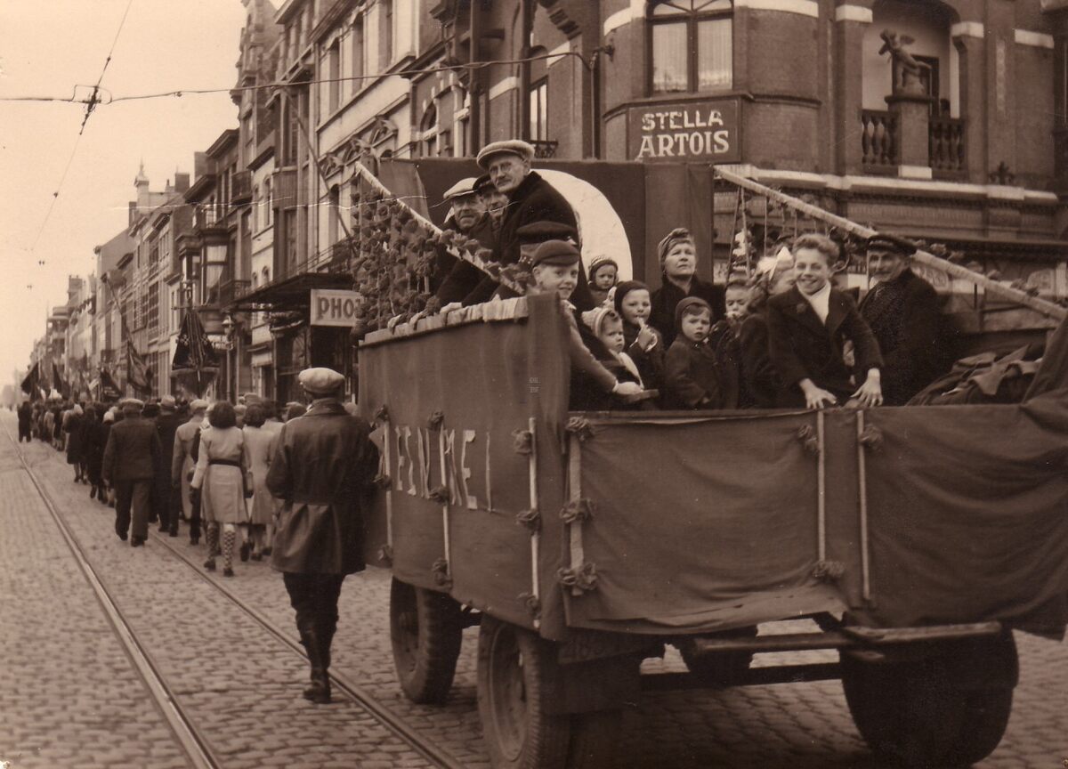 De 1-meistoet 1947 op de Nieuwpoortsesteenweg aan de Koninginnelaan (rechts). Achter de wagen, café "Le Chatelet".