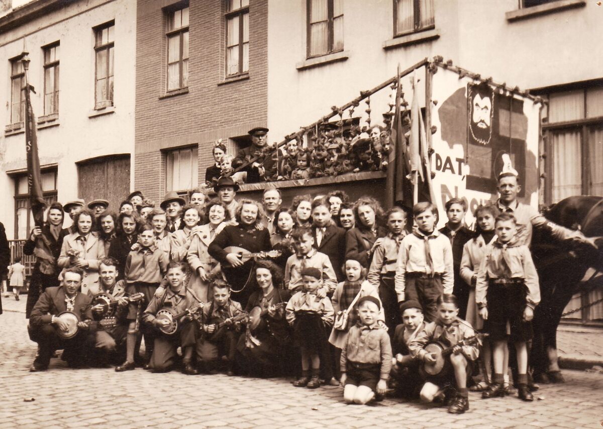 Een afdeling van de "Rode Valken" staat klaar in de Jules Peurquaetstraat, toen Veldstraat, om op te stappen in de 1-meistoet 1947. De verwijzing op de wagen is naar Staf DECLERCQ, leider V.N.V. en naar Leon DEGRELLE, leider van R.E.X., twee topcollaborateurs met de Duitse bezetter.