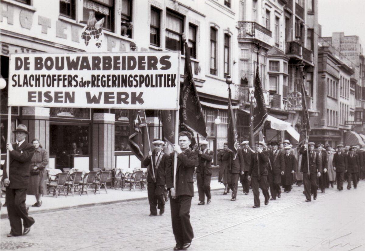 De 1-meistoet aan het Hotel du Parc op het Marie-Joséplein. Er wordt een bord gedragen met de tekst : "De bouwarbeiders. Slachtoffers der Regeringspolitiek. Eisen Werk". De stoet komt uit de Adolf Buylstraat.