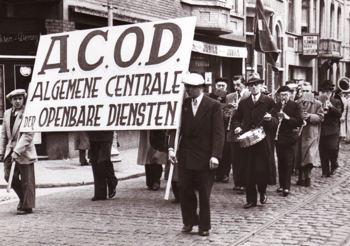 De 1-meistoet op de Nieuwpoortsesteenweg ter hoogte van de Eduard de Cuyperstraat. Er wordt een bord gedragen met de tekst : "A.C.O.D. Algemene Centrale der Openbare Diensten". Er achter een muziekkorps. Zichtbaar het uithangbord van "Café Flamingo".