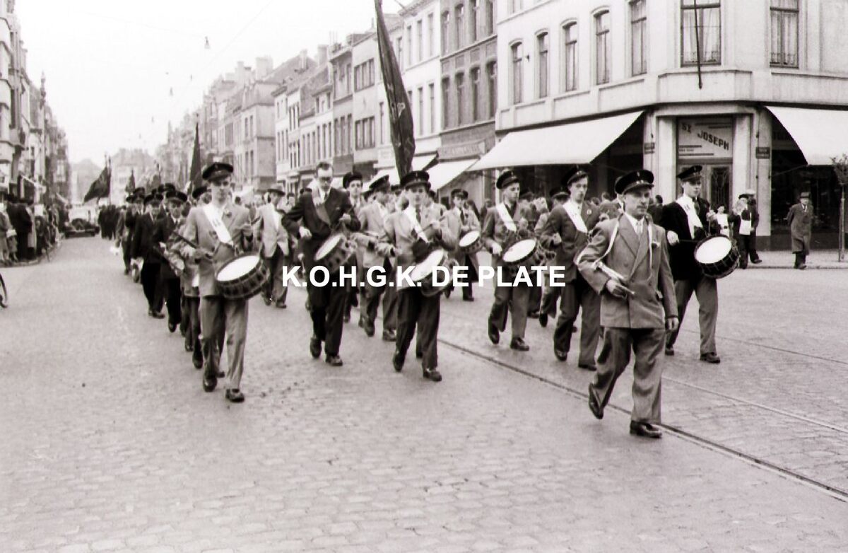 Een muziekkorps in de 1-meistoet op de Alfons Pieterslaan, met textielhandel St. Joseph.hoek Rogierlaan.