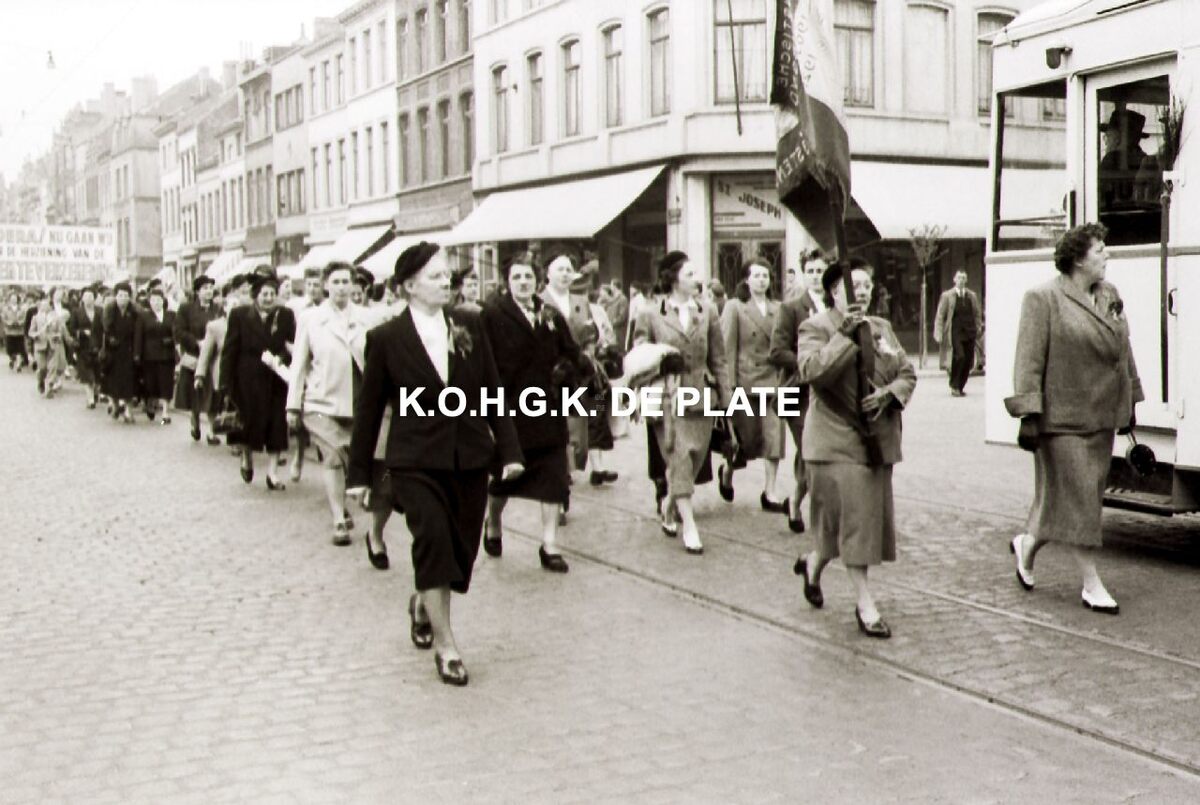 De S.V.V. vrouwen met vlag passeren op de Alfons Pieterslaan aan de hoek met de Rogierlaan tijdens de 1-meistoet. Op de hoek textielhandel St. Joseph.