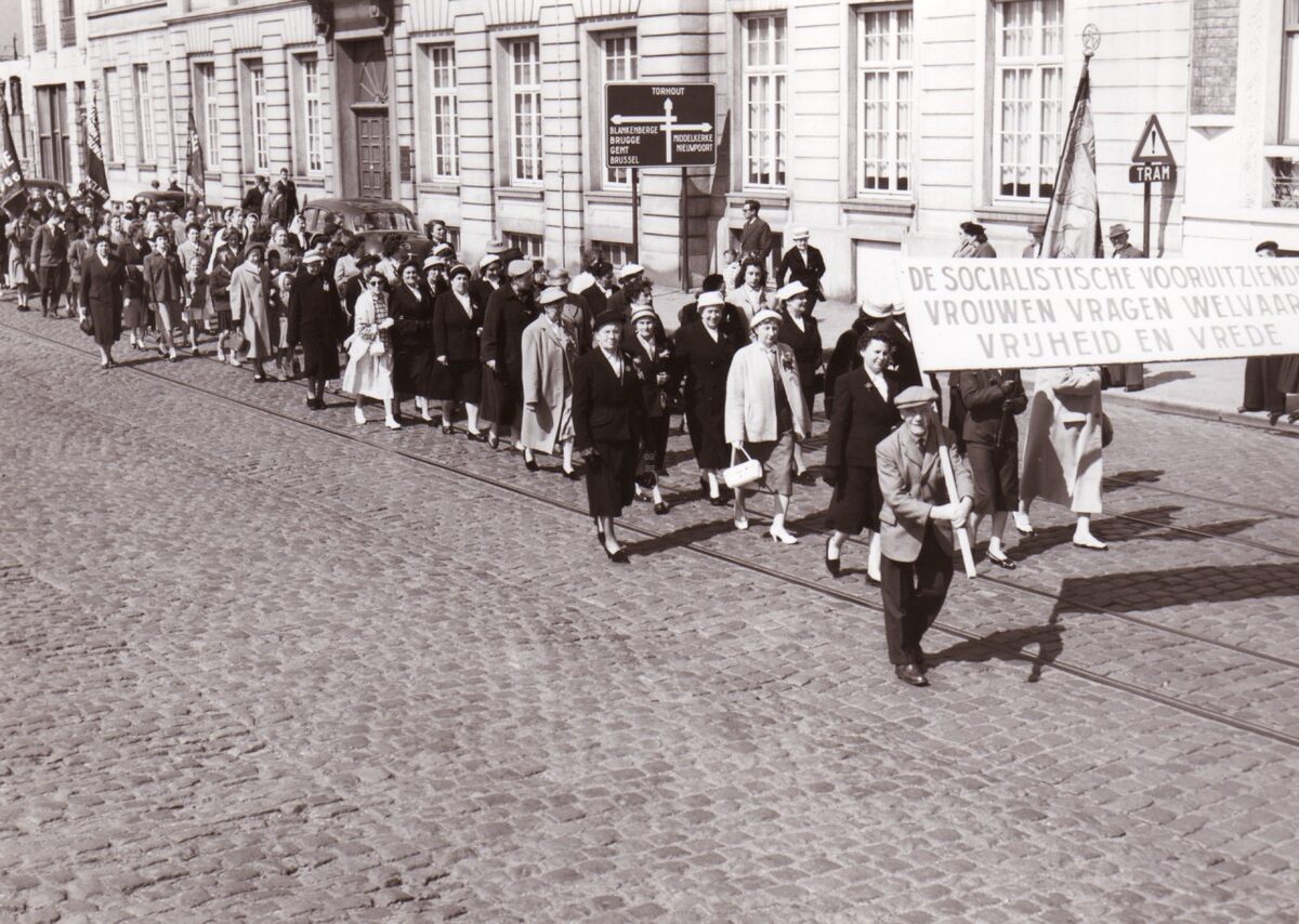 De S.V.V. (Socialistische Vooruitziende Vrouwen) stappen mee in de 1-meistoet op de Vindictivelaan ter hoogte van het O.L.V. College. Er wordt een bord gedragen met de tekst : "De Socialistische Vooruitziende Vrouwen Vragen Welvaart Vrijheid en Vrede".