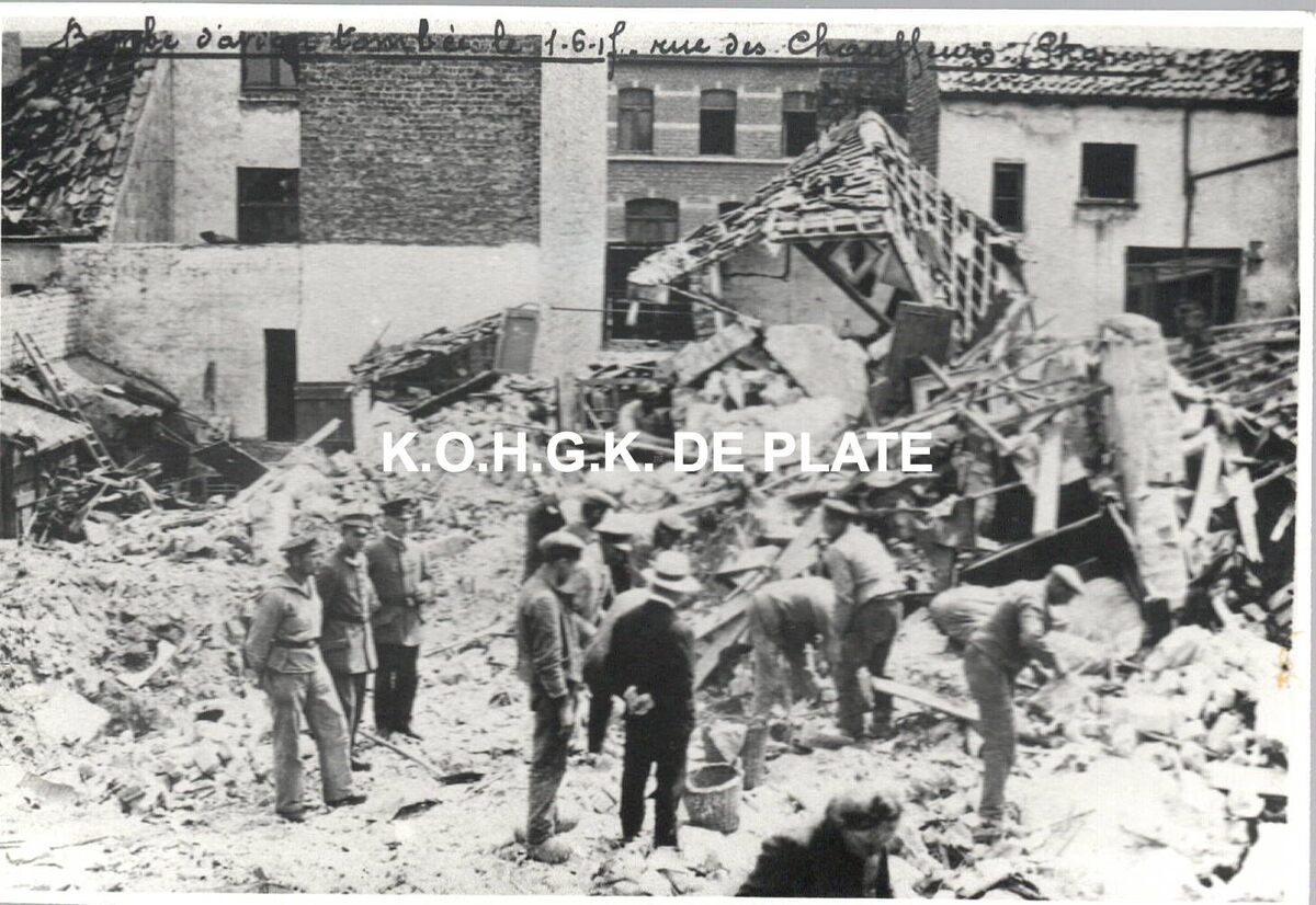 Formaat : 8,5 x 12,5 cm. - Bombe d'avion tombée le 1-6-17, rue des Chauffeurs (Phare). - Na een luchtbombardement werden de woningen 35, 37, 39, 41, 43 tot en met 55 vernield.