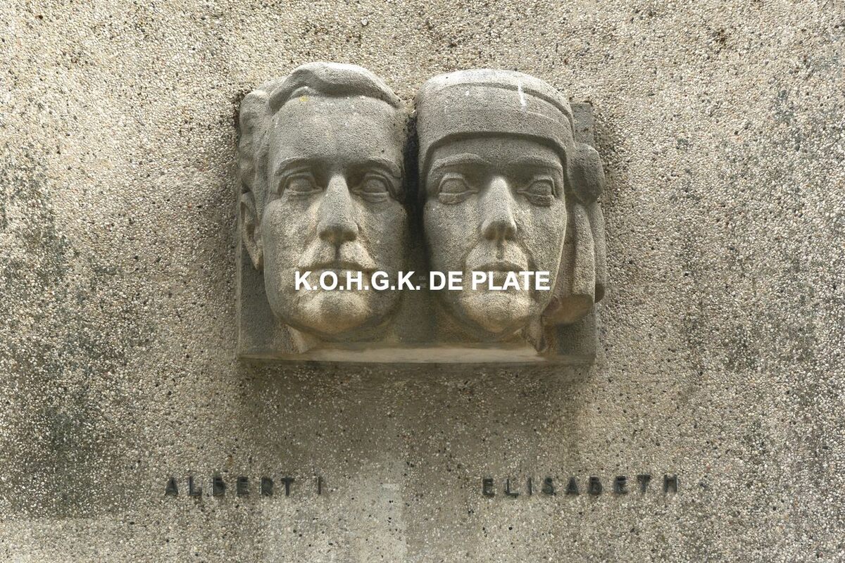 Oorlogsmonument gelegen in het plantsoen van de Sint Petrus- en Pauluskerk, nabij de Sint-Pieters- en Jozef II-straat. Dateert van 1968 naar een ontwerp van beeldhouwer August Michiels en architect J. Lewyllie. Gebogen muur, waarin de portretkoppen van Koning Albert I en Koningin Elisabeth met opschrift in bronzen letters "Albert" en "Elisabeth. Erachter los ervan rug aan rug geplaatste hoge muren met hoogreliëfs, restanten van het oud oorlogsmonument van 1922.