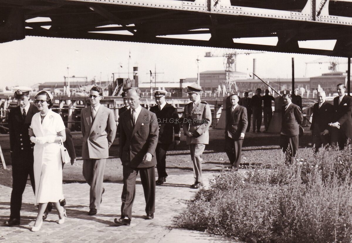 Formaat : 13 x 18 cm. - De koninklijke familie bij de Demeybrug. Vooraan, Prins Albert en Prinses Lilian Baels, Koning Leopold III en Koning Boudewijn. Achteraan, schepen Jan Piers en voor hem havenkapitein René Becu.