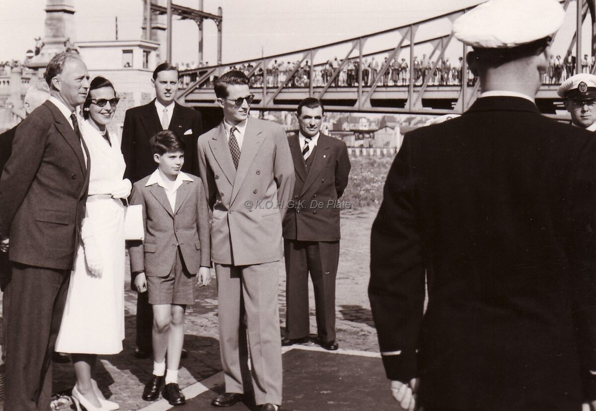 Formaat : 13 x 18 cm. - De blijde koninklijke familie aan de Demeybrug. Van links naar rechts, Koning Leopold III, Prinses Lilian Baels, Prins Alexander en Koning Boudewijn. Achter Prins Alexander, schepen Jan Piers en havenkapitein René Becu. Zij wachten om aan boord te gaan van het fregat "LTZ Victor Billet" waarmee Prins Albert een instructiereis onderman.