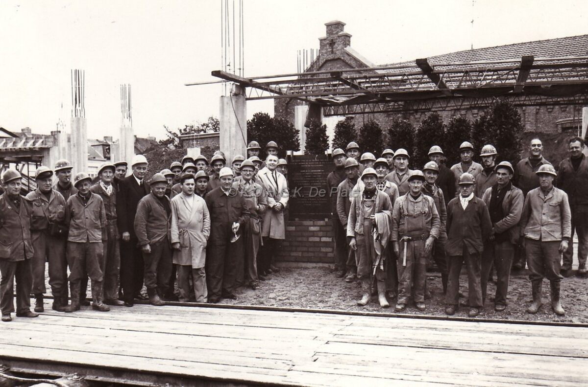 De werklui van de aannemersfirma P.V.B.A. V.R. en J. VAN COILLIE bij de eerste steen van het rusthuis de "Boarebreker" van het O.C.M.W.Centraal met regenjas Jan VAN COILLIE van deze firma.