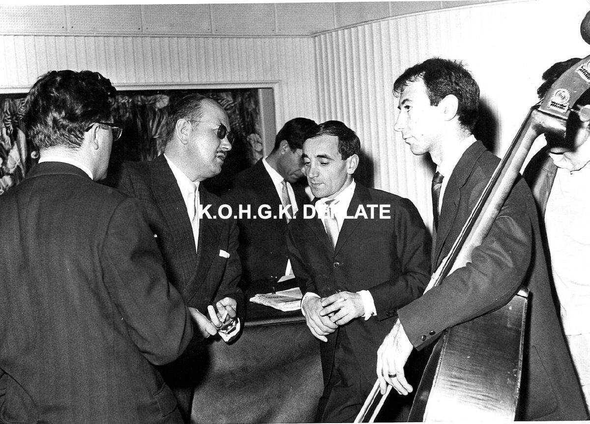 Formaat : 13 x 18 cm. - Charles Aznavour in gesprek met o.a. Roger De Ramée, directeur van de Kursaal.