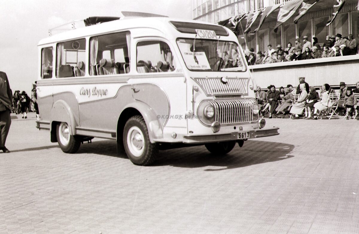 Een kleine autobus van de firma "Cars Poppe" tijdens een defilé op de zeedijk aan "Petit Nice".