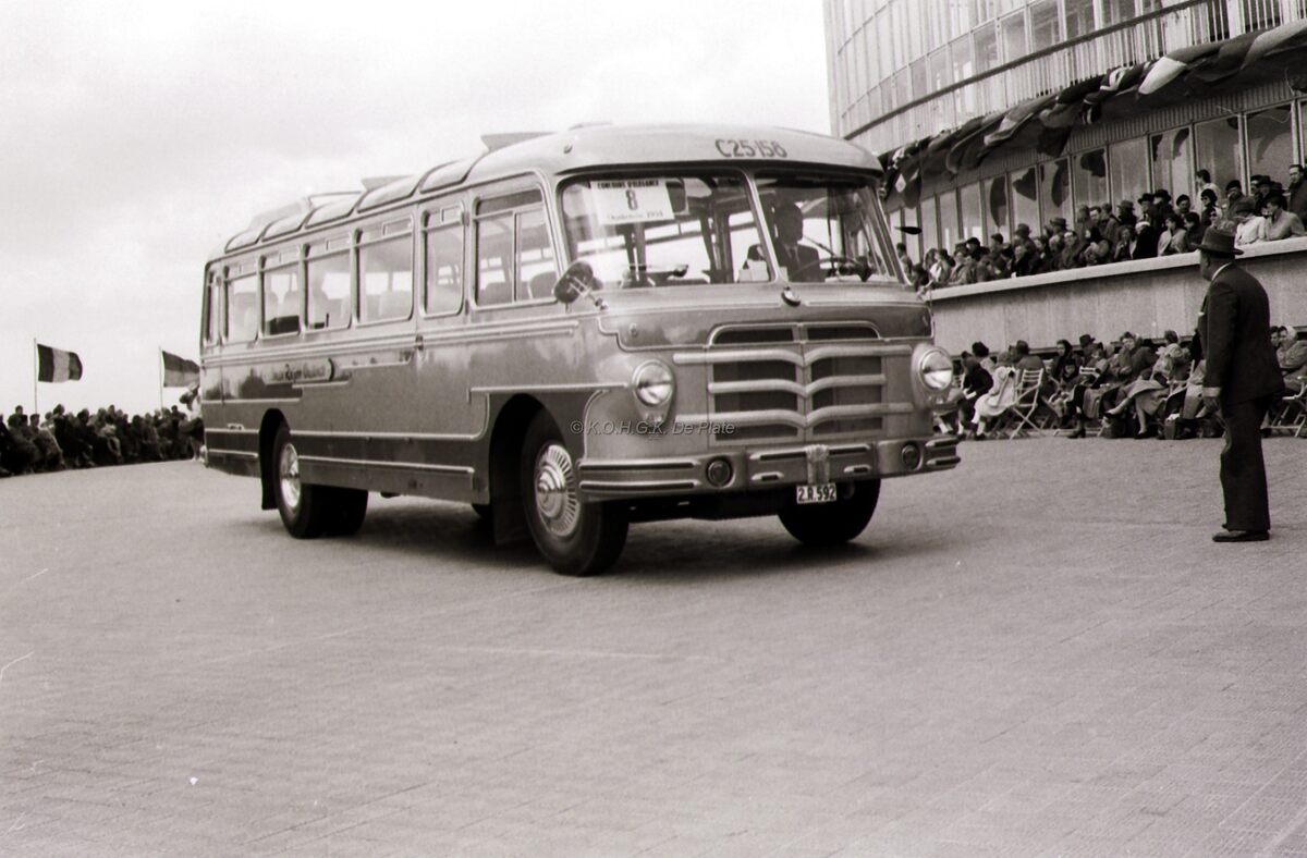 Een autobus komt tijdens het defilé voorbij het Kursaal aan "Petit Nice" op de Albert I Promenade.