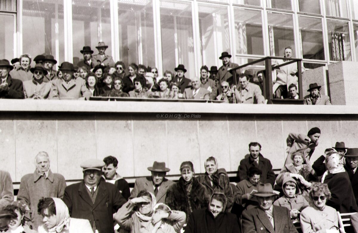 Een gedeelte van het publiek aan "Petit Nice" tijdens een defilé van autobussen op de Albert I Promenade.Tweede van links bij de verslaggever, schepen Maurice QUAGHEBEUR.