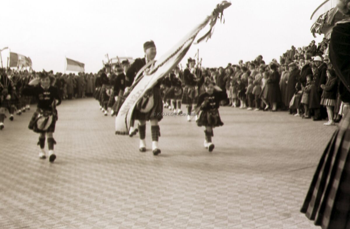 De "Oostendse Schotten" komen eraan ! Ze nemen deel aan een defilé van bussen op de Albert I Promenade.