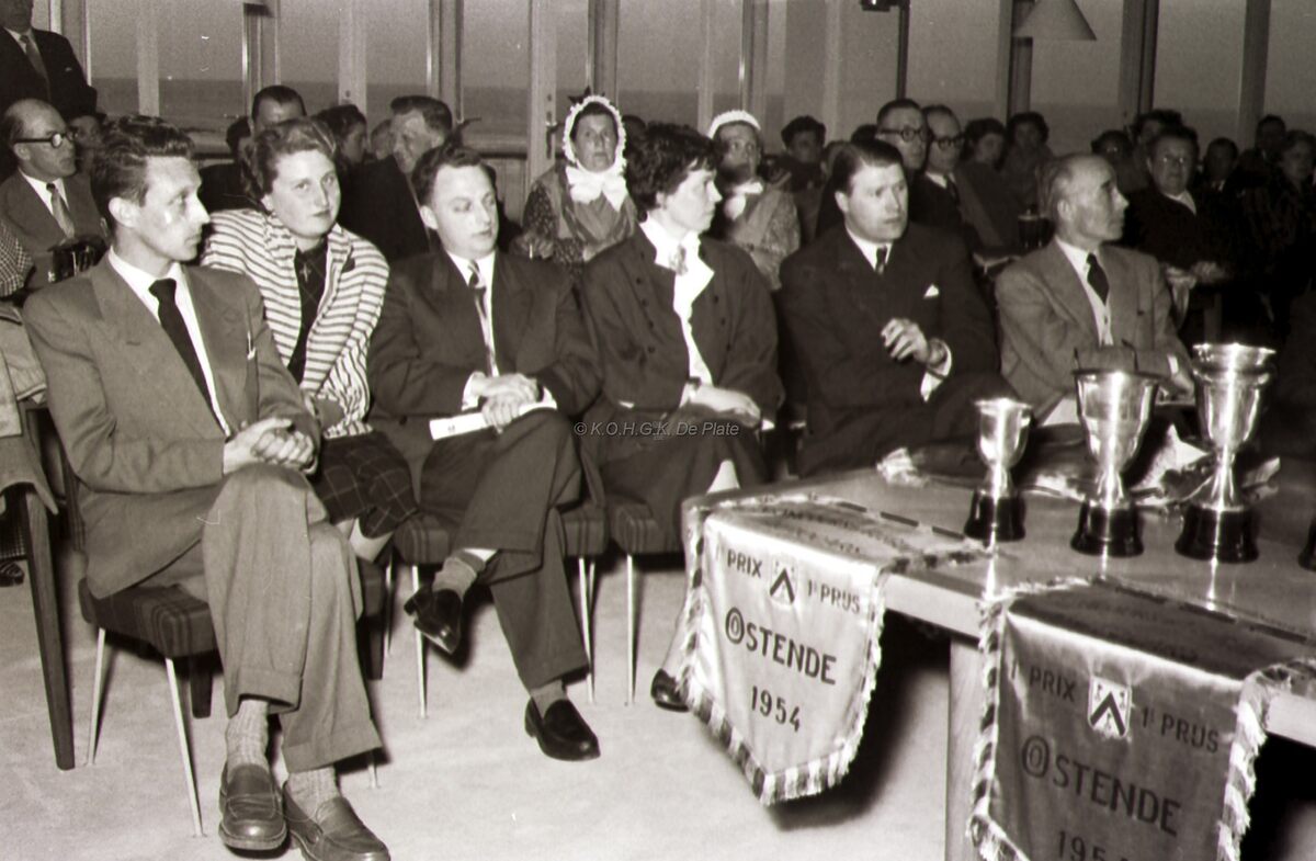 Het Kursaal, een gedeelte van de deelnemers aan het defilé van autobussen, tijdens de prijsuitreiking. Let op de twee vaandels en bekers.