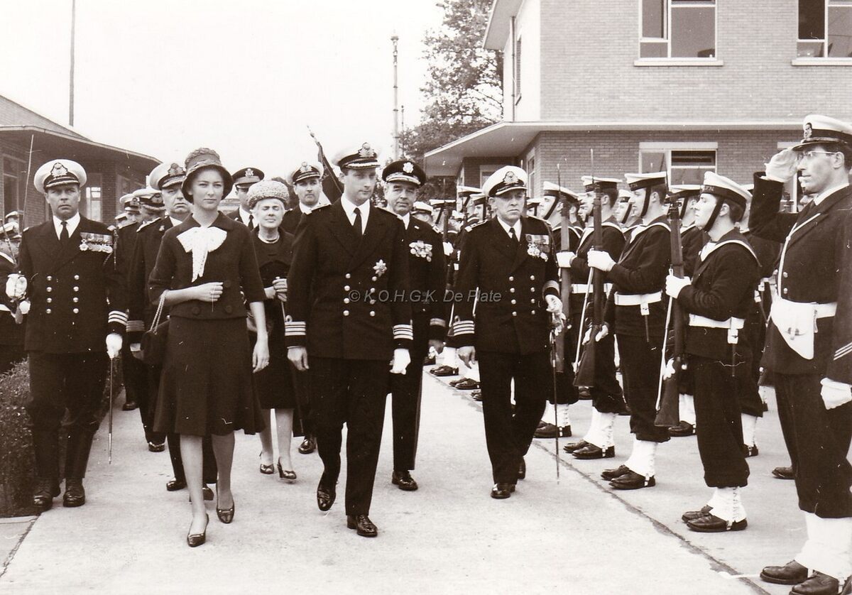 Prins Albert in het uniform van fregatkapitein en Prinses Paola schouwen een erewacht van de Zeemacht tijdens hun bezoek aan Oostende naar aanleiding van de aankomst van de hoogzeemijnenveger "J.E. Van Haverbeke" uit de Verenigde Staten. Links van de prinses Korvetkapitein Vervynck (met sabel). Rechts van de prins Kapitein ter Zee Delforge.