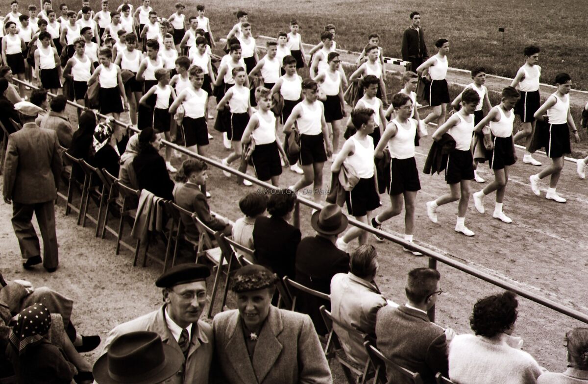 Optocht van deelnemers aan het zomerfeest van Hermes op hun stadion.