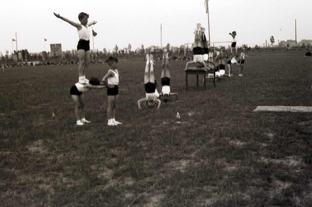 Jonge turners geven een staaltje van hun kunnen tijdens het zomerfeest 1954 van Hermes.