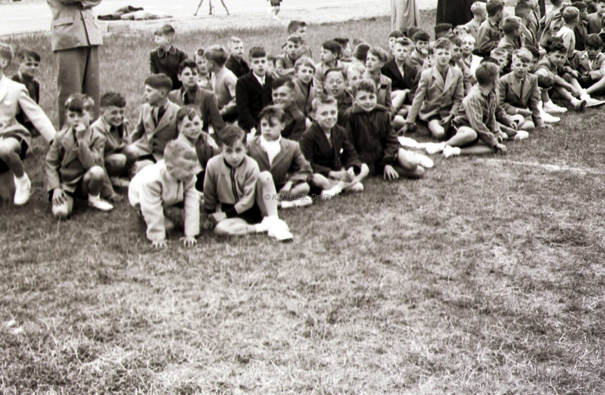 Een groep jonge deelnemers aan het zomerfeest van Hermes op hun stadion.