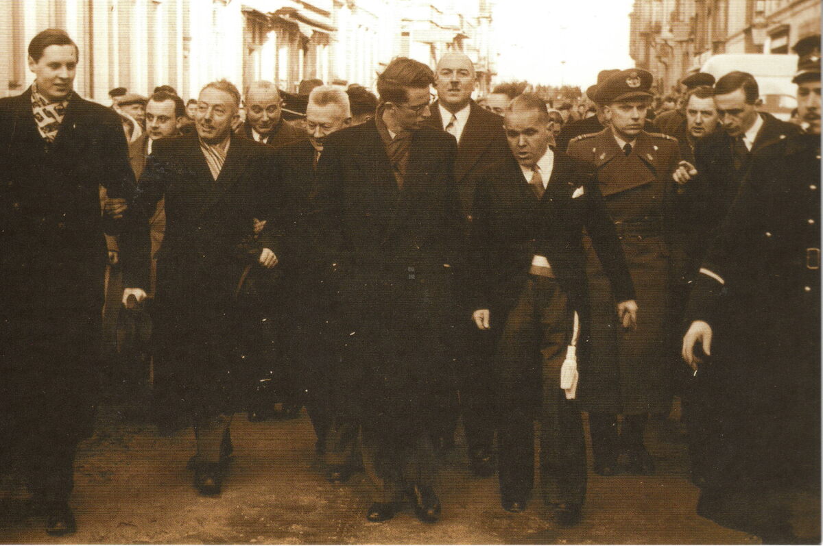 Tropic T 396. - Ostende oender woater 1953. - Koning Boudewijn bezocht onze stad in het gezelschap van het stadsbestuur op 03/02/1953. Koning Boudewijn in gesprek met burgemeester Adolf Van Glabbeke. Tweede van links, Oscar Behogne, minister van Openbare Werken, naast Jan Piers.