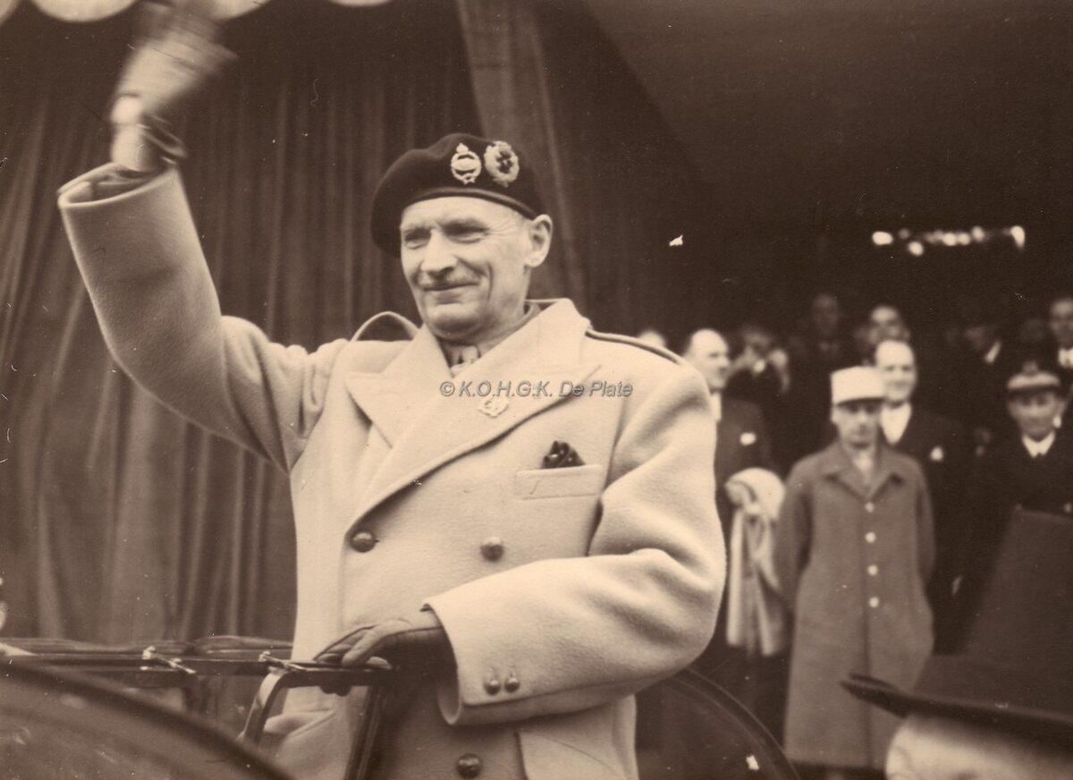 Close up van veldmaarschalk Montgomery tijdens zijn bezoek aan Oostende. Op de achtergrond franse officieren.