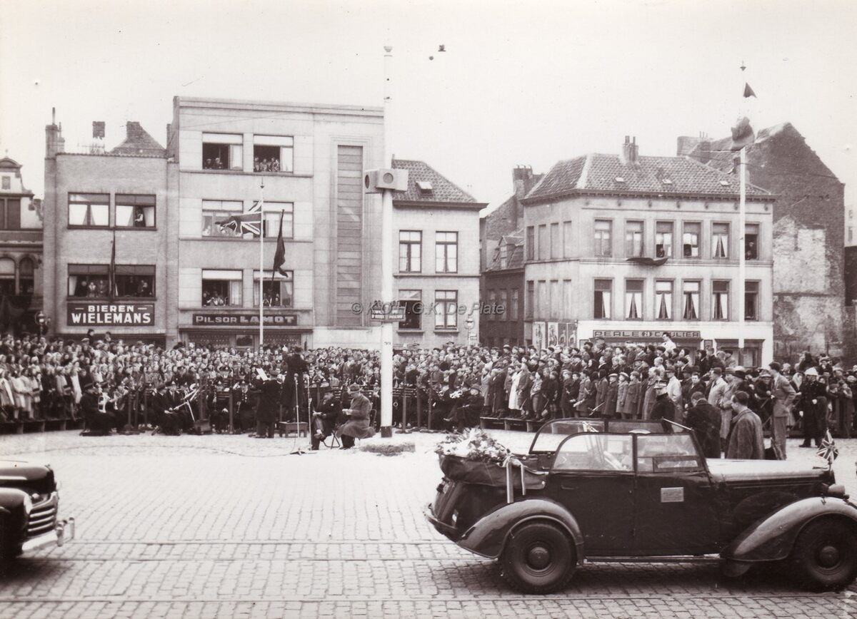 Uitvoering van een gelegenheidscantate op het Vissersplein ter ere van het bezoek van veldmaarschalk MONTGOMERY aan onze stad. "Homage to our Liberators" van Alfons Maes (tekst) en E.D. Boehme (muziek). Let ook op de verdwenen huizenblok tussen de Bonen- en de Cadzandstraat