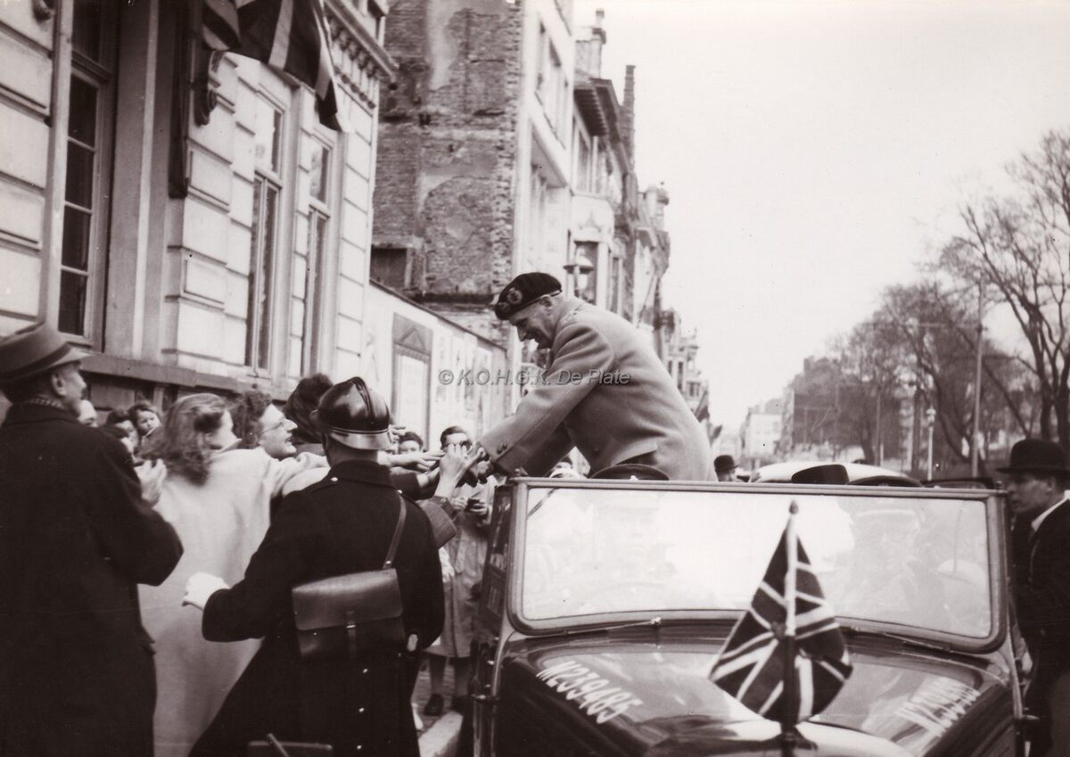 Veldmaarschalk MONTGOMERY wordt tijdens zijn eerste bezoek aan Oostende, aan de woning van burgemeester Henri Serruys in de Karel Janssenslaan, begroet door enkele enthousiaste vrouwen. Rechts het Leopoldpark.